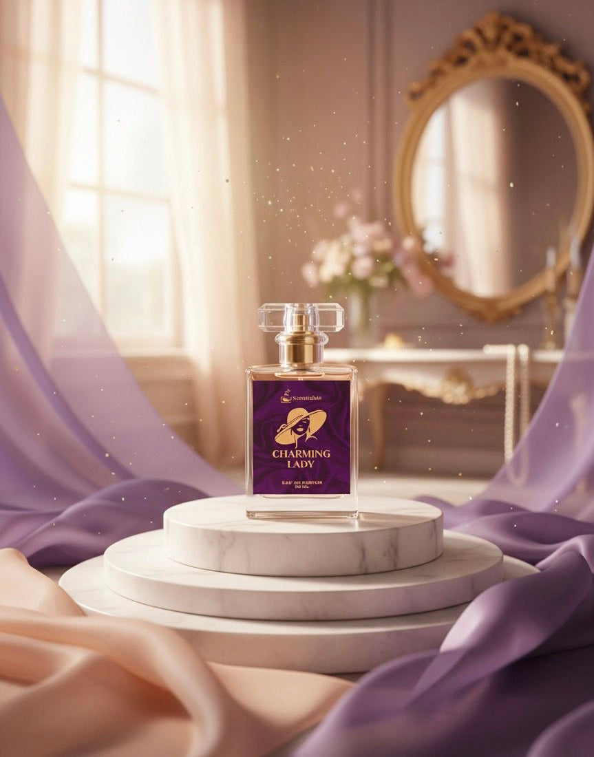 Charming Lady by Scentsible – A fragrance that celebrates timeless femininity and grace. It opens with a touch of lively fruity freshness, leading into the heart of romantic rose and soft floral notes that bloom with elegance. The result is a sweet, enchanting scent that lingers beautifully, leaving a trail of charm wherever you go.